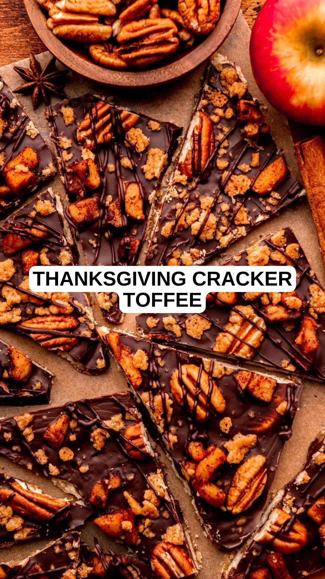 Get ready to fall in love with this Thanksgiving cracker toffee! It’s a delicious mix of buttery toffee-covered crackers, topped with a layer of chocolate, spiced apples, streusel, and pecans.