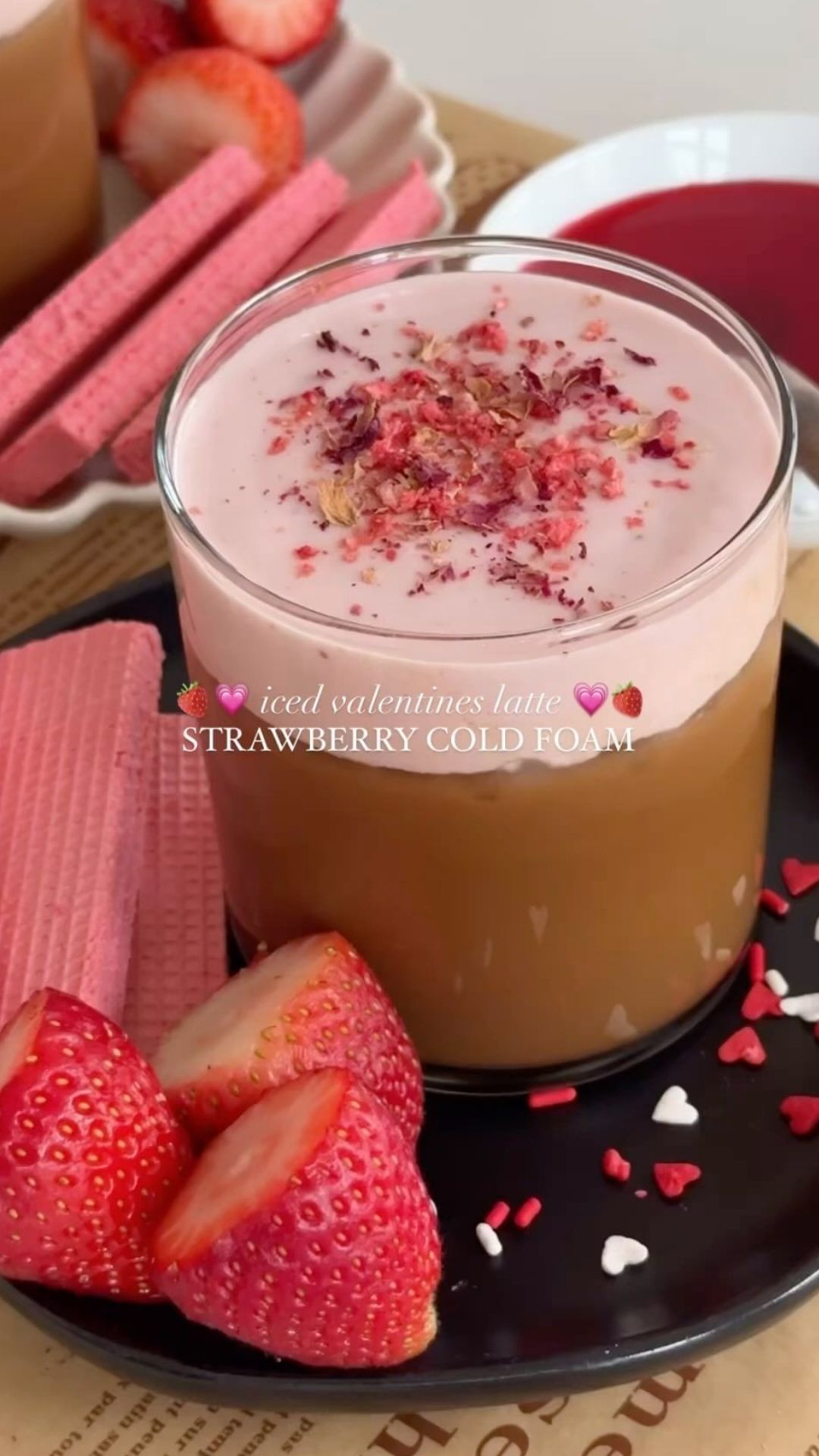 2. Add milk and ice to your liking, then top with strawberry cold foam.