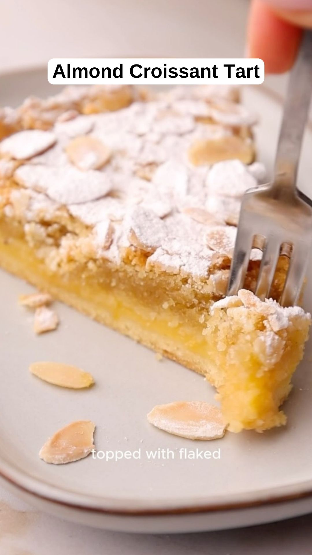 This dessert features soft, buttery shortcrust pastry filled with almond cream and frangipane, topped with flaked almonds and a dusting of powdered sugar. Made without eggs or dairy, it’s almost like a Bakewell Tart, with all the flavor you love from an almond croissant.