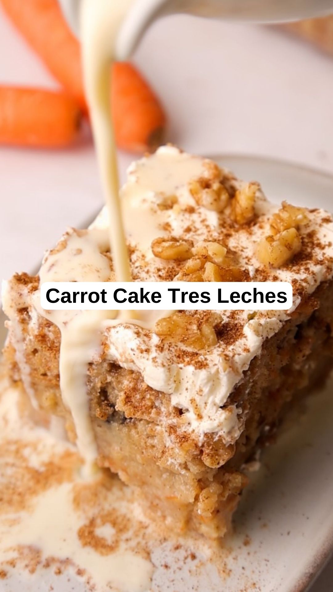 This cake is super moist and full of warm spices, soaked in a rich mix of three types of milk. Topped with creamy whipped cream cheese frosting and crunchy crushed walnuts, it combines the best of both carrot cake and tres leches. And the best part is, it’s really easy to make!