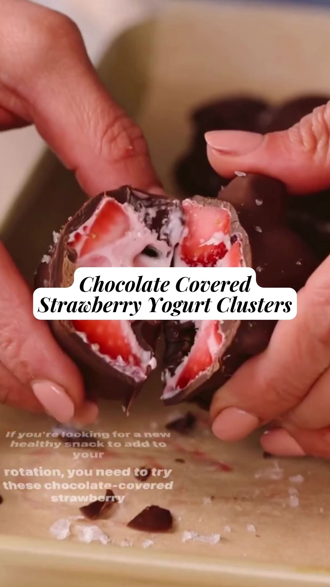 - Once the chocolate is melted, take the tray out of the freezer and dip each strawberry cluster into the chocolate. The chocolate will create a yummy shell around each one! Feel free to sprinkle some sea salt on top if you like. Then, dig in and enjoy! Any leftovers can be stored in the fridge for up to a week or in the freezer for up to a month!