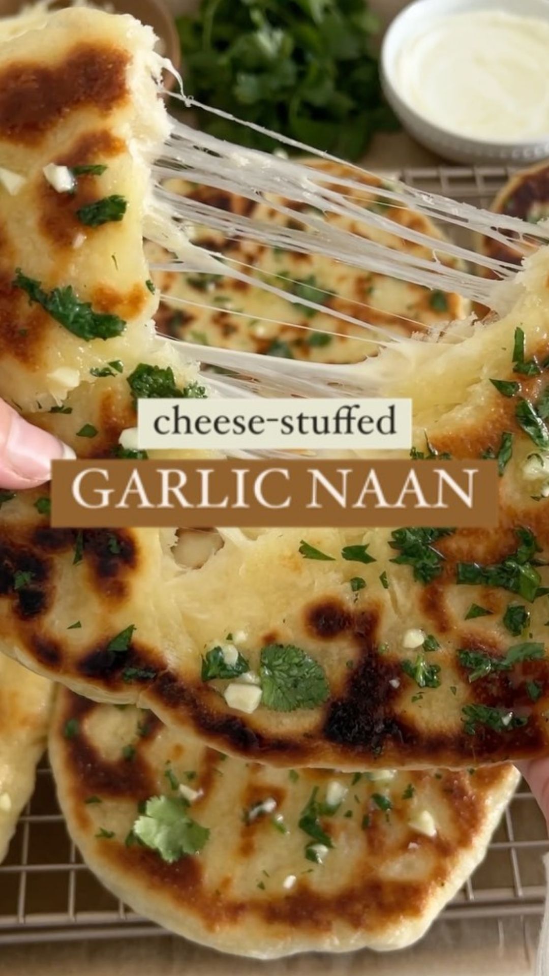 Get ready for a cheesy delight with our Cheese-Stuffed Garlic Naan! The irresistible combination of cheese and bread makes this a match made in heaven. Imagine the fluffiest bread stuffed with gooey mozzarella and tangy parmesan cheese, then cooked on a skillet to perfection and dressed in a mouthwatering garlic cilantro butter.
