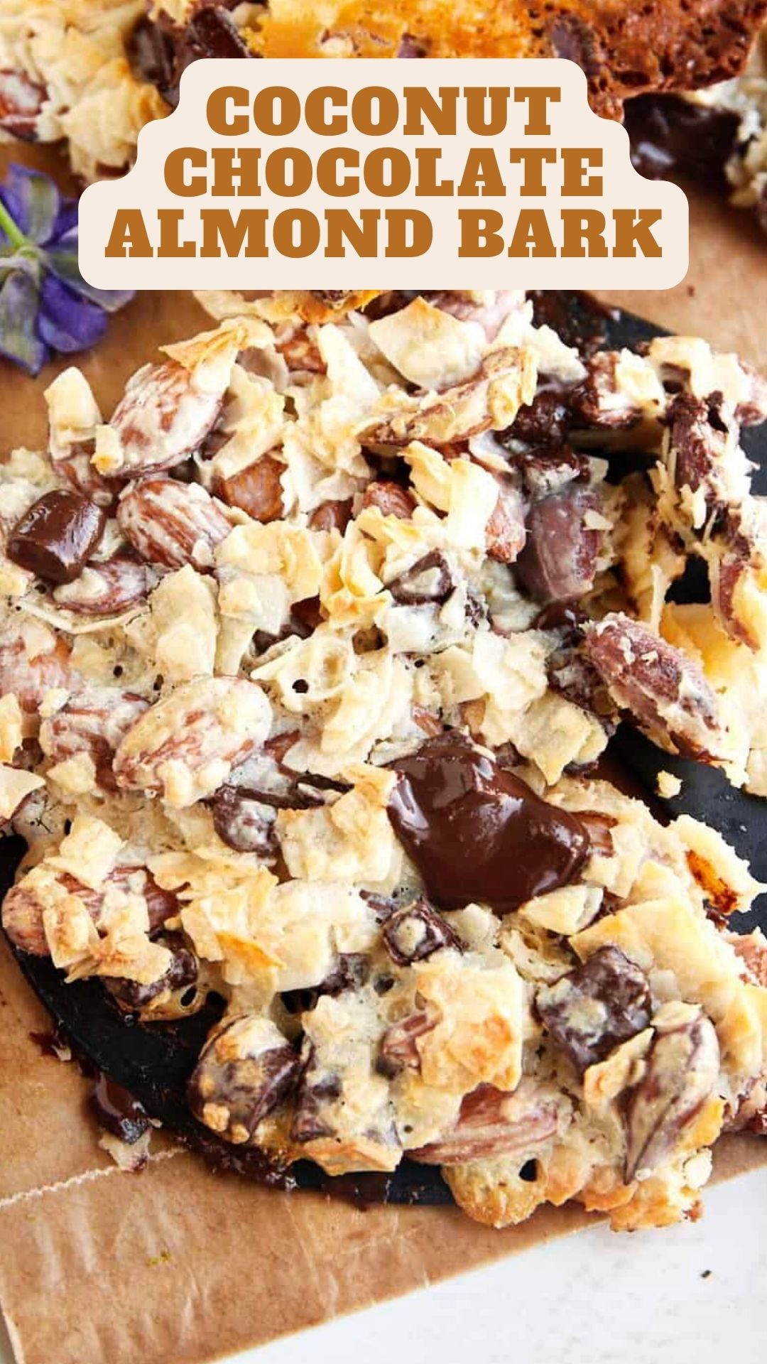 - Once cooled, break the almond coconut chocolate bark into pieces.