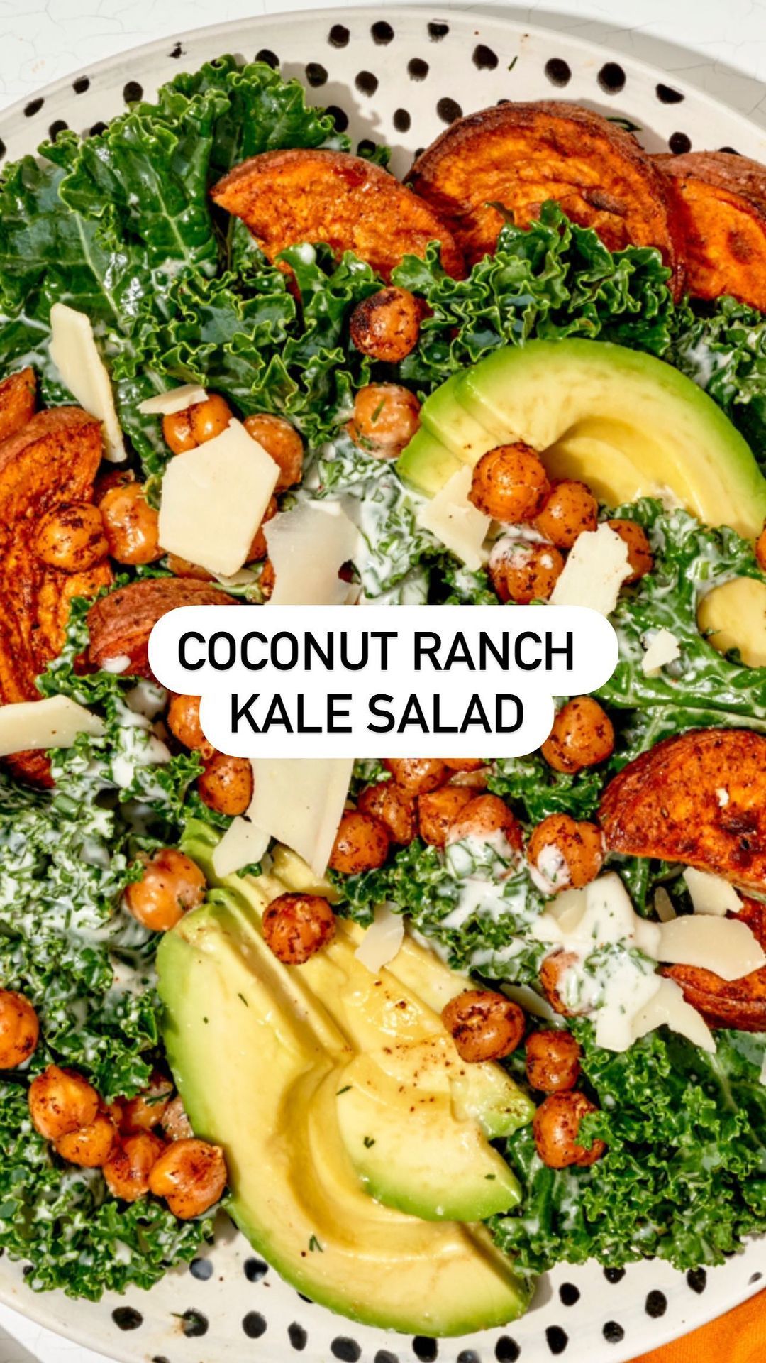 4. Step 4: Massage kale with salt for about 1 minute. Place in a bowl and top with sweet potatoes, chickpeas, avocado, and vegan parmesan. Drizzle with coconut ranch and enjoy!