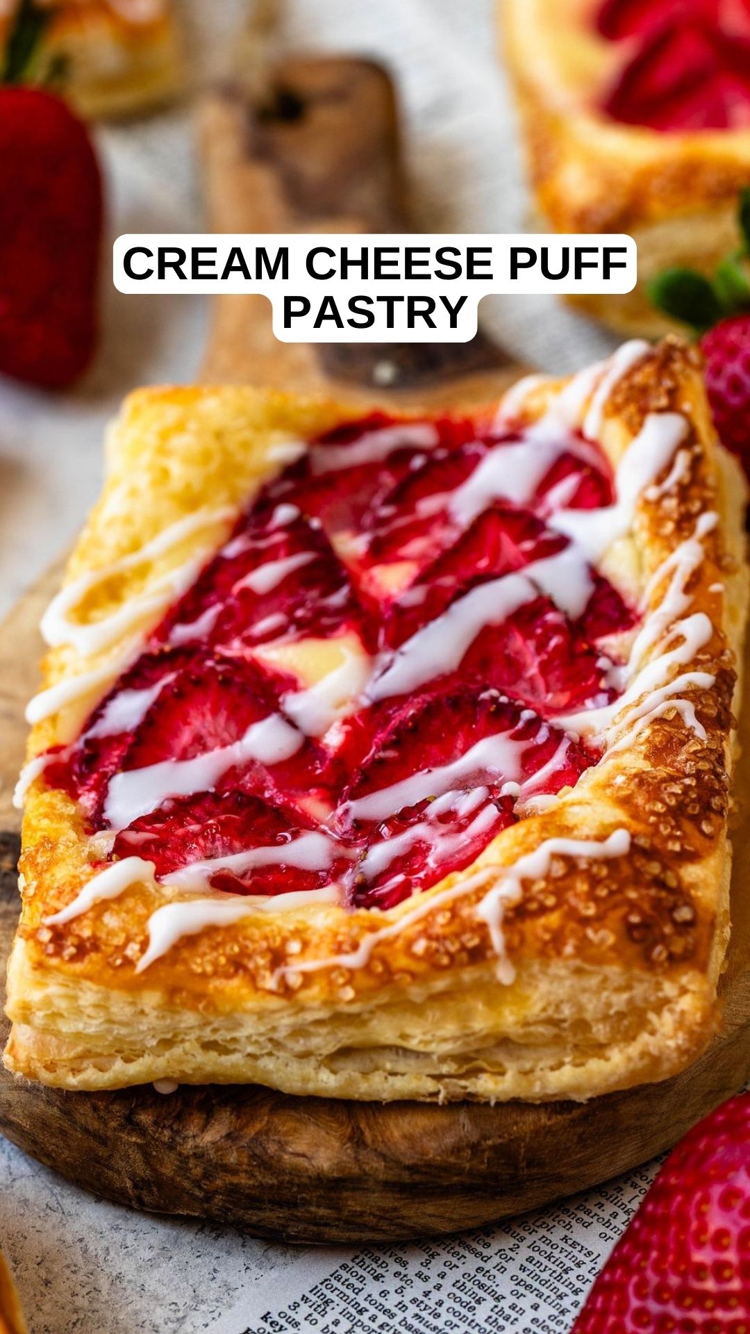 This Cream Cheese Puff Pastry is a breeze to make and tastes amazing! You can use any fruits, berries, jam, or just the cream cheese filling. This recipe is incredibly versatile. I made several variations with strawberries, blueberries, blackberries, raspberries, jam, and some with just plain cream cheese filling.