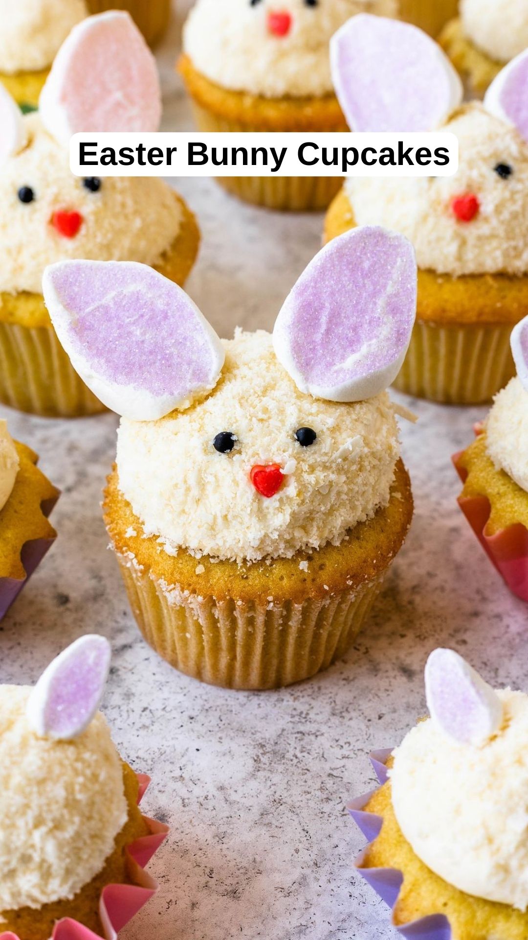 Whether for a family dinner or a gathering with friends, these Easter Bunny cupcakes are sure to bring smiles all around. Besides being tasty, their presentation is irresistibly cute, with marshmallow bunny ears and pink noses.