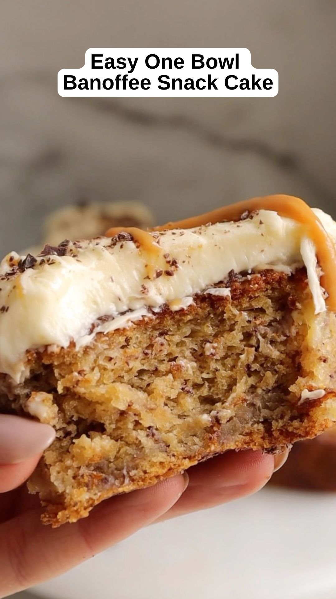 A soft banana cake soaked in toffee and topped with creamy vanilla frosting ๐ This Banoffee Snack Cake is super easy to make in just one bowl, plus itโs vegan, high in protein, and absolutely delicious! This Banoffee Snack Cake is a sweet, indulgent treat thatโs sure to satisfy! Enjoy!