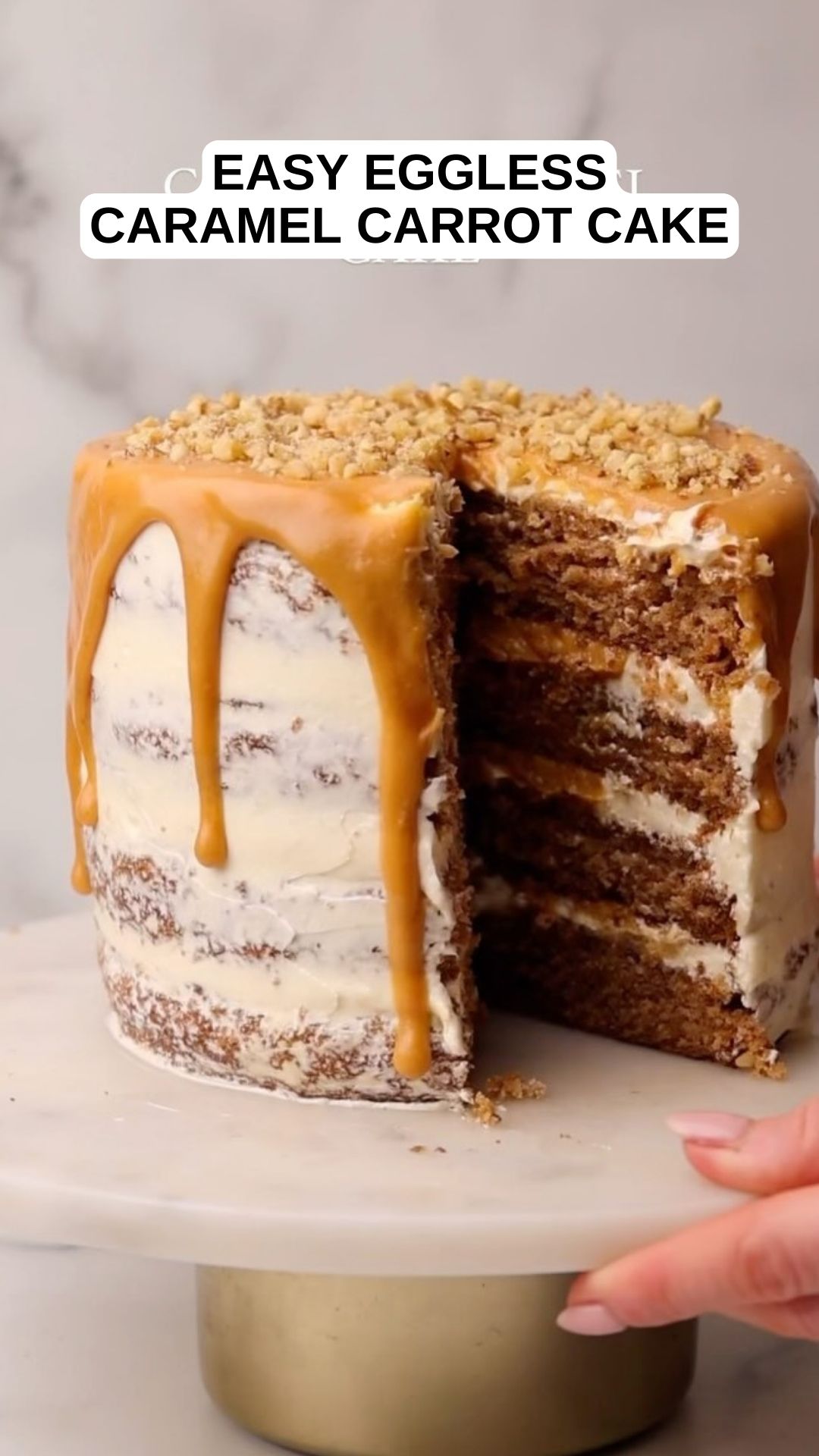 This is the best carrot cake, featuring four layers of super moist, perfectly spiced sponge, velvety cream cheese frosting, and gooey caramel. My recipe is egg-free and dairy-free, and the best part is, it’s super simple to make.