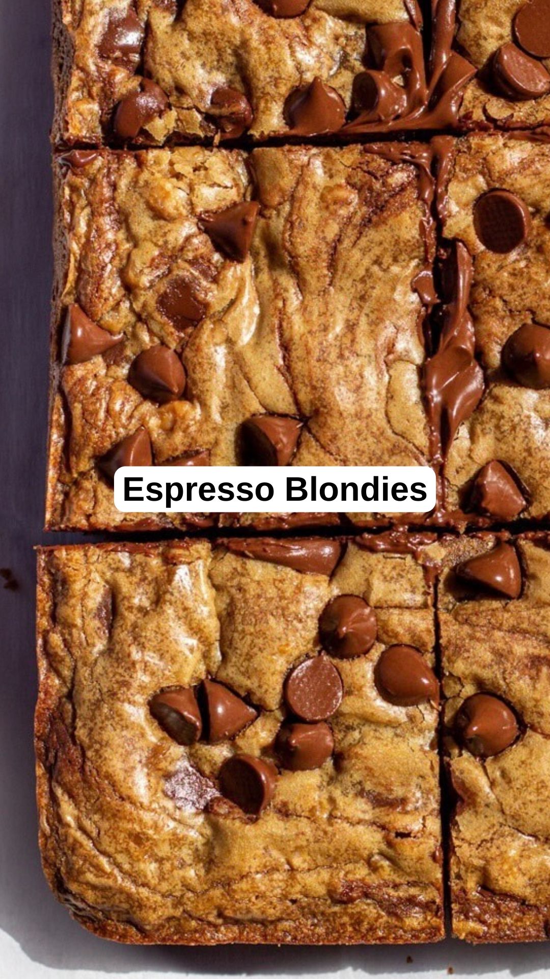 Espresso blondies combine the best of brownies and chocolate chip cookies into one delicious bar with a coffee twist. They’re soft in the middle, chewy on the outside like a brownie, and have the amazing flavor of a chocolate chip cookie. Plus, they’re super easy to make in one bowl, just like cookie dough. Simply spread the batter in a pan and bake. This espresso version includes a bit of espresso powder for an extra kick.