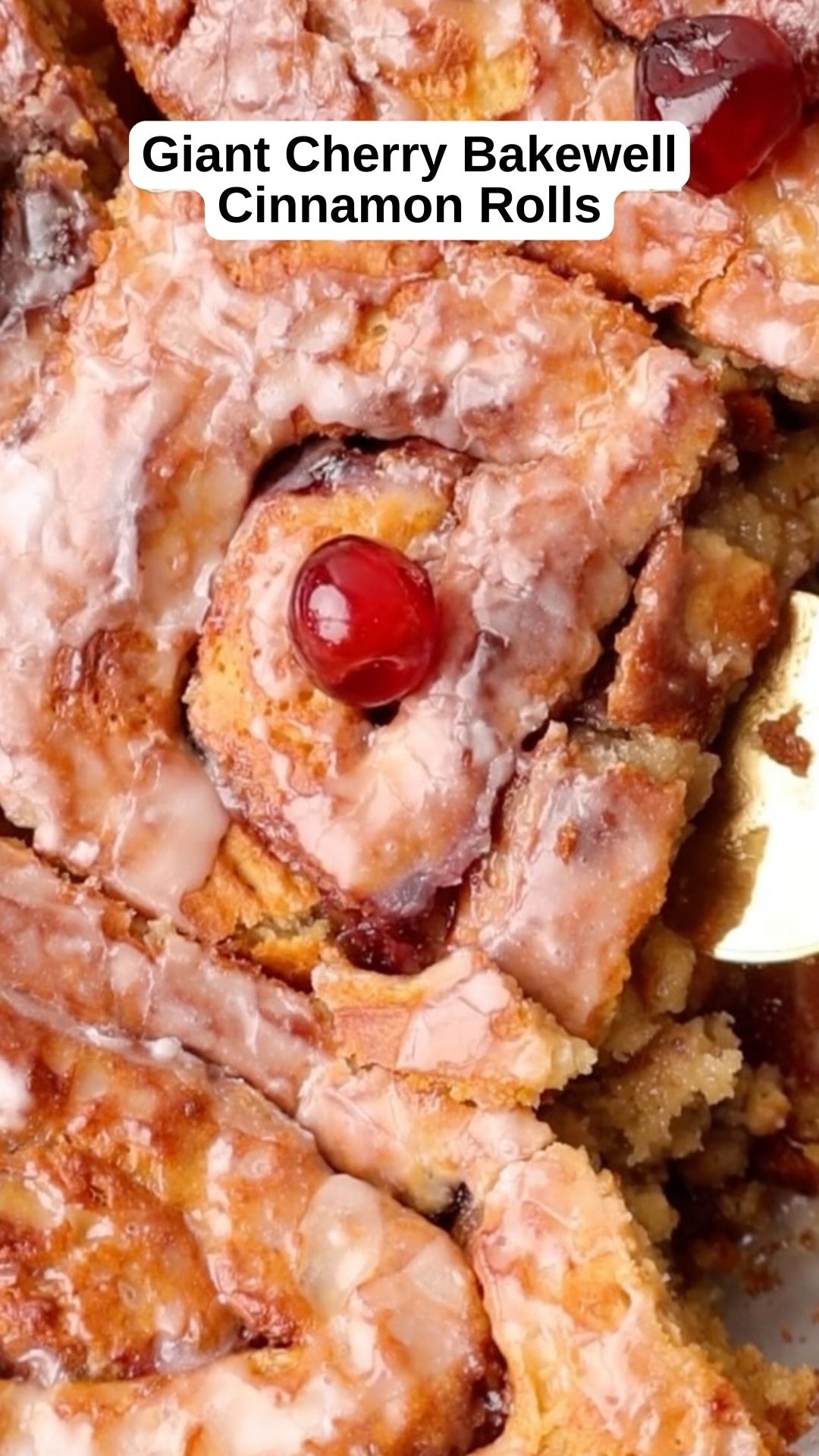 These Giant Cherry Bakewell Cinnamon Rolls feature a sweet almond cherry filling and a vanilla glaze for a perfect crispy top. Perfect for any cherry Bakewell lover!