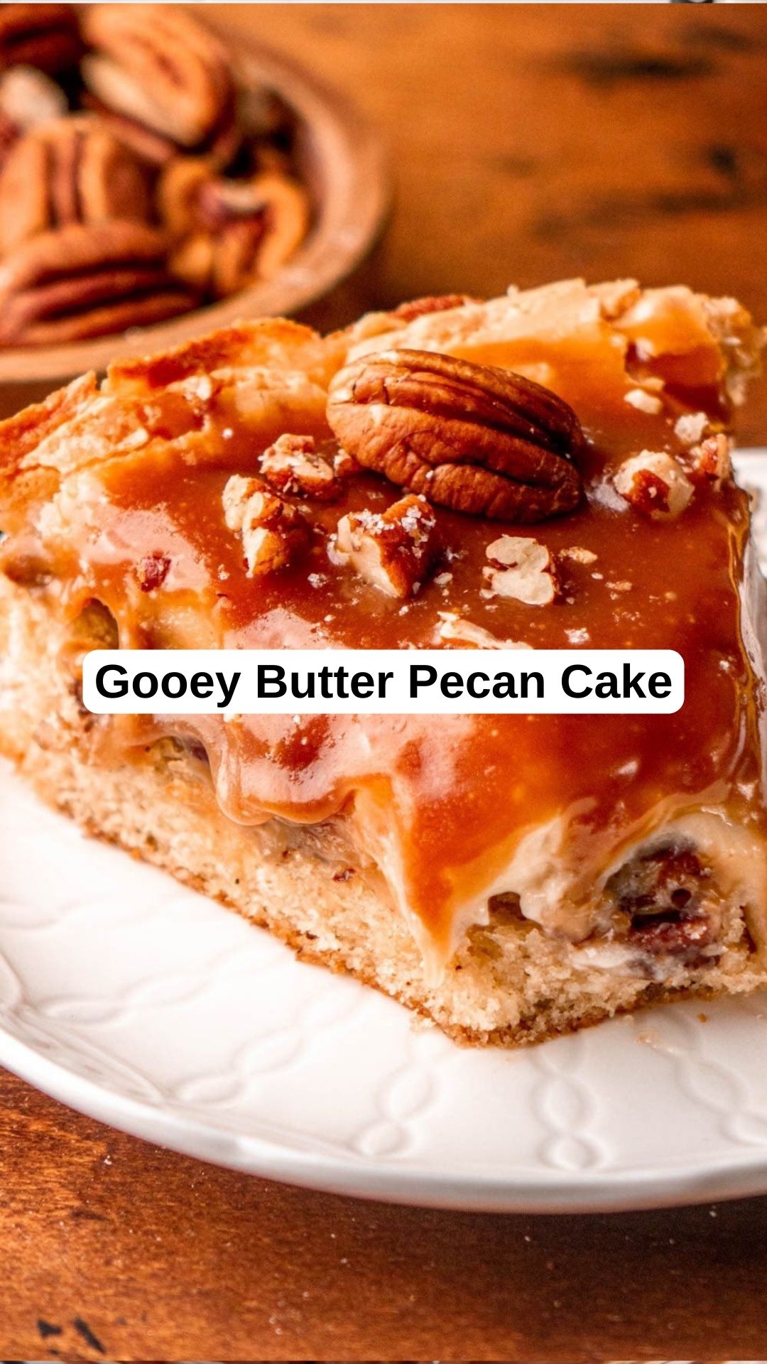 This gooey butter pecan cake is a true delight! With a brown butter cake base, buttered pecans, gooey cream cheese topping, and a drizzle of salted caramel sauce, each bite is buttery, sweet, and melts in your mouth.