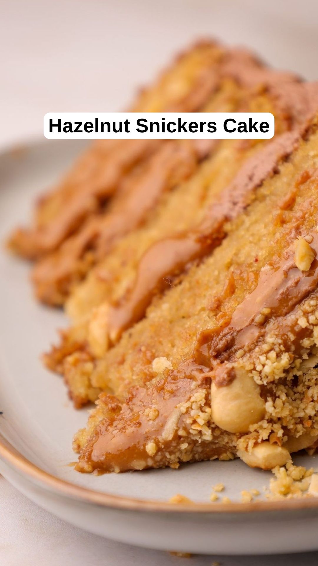 The cake features a soft hazelnut sponge, crunchy roasted hazelnuts, gooey caramel, and a creamy chocolate hazelnut buttercream. Each bite blends the sweet and nutty flavors perfectly, with crunchy hazelnuts and smooth caramel enhancing the rich milk chocolate taste.