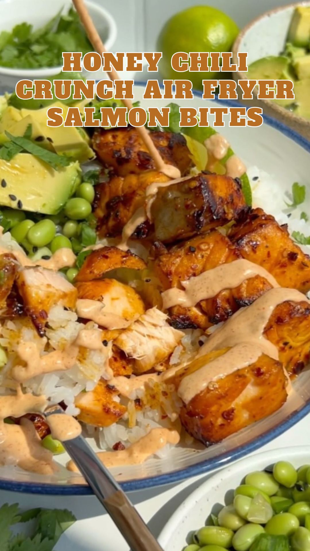- Assemble bowls with salmon, edamame, rice, avocado, cilantro, and chili crunch.