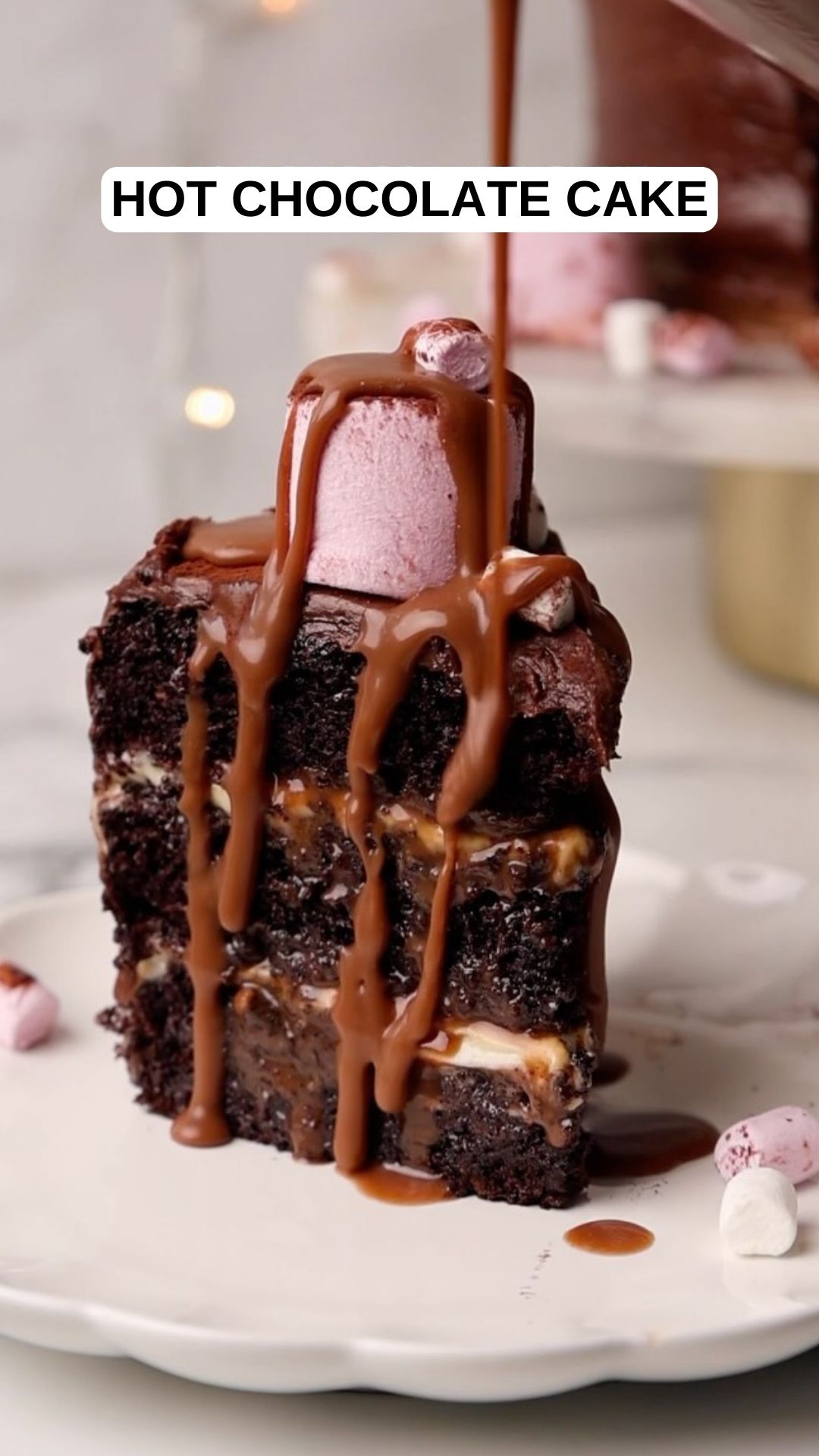 Imagine three fluffy layers of rich hot chocolate cake, filled with smooth vanilla buttercream and dripping with chocolate sauce, all wrapped in a luscious hot chocolate ganache and topped with marshmallows!