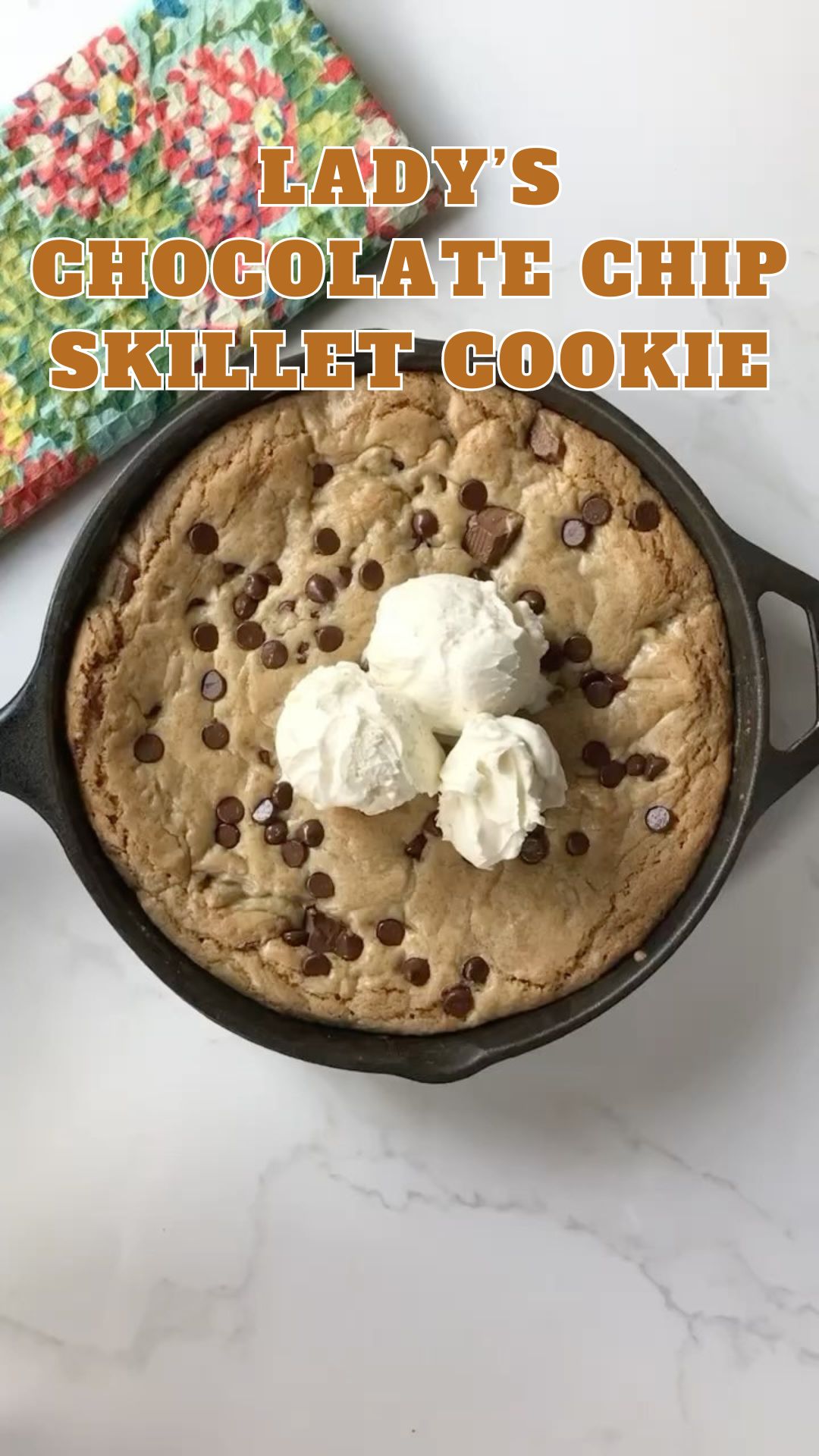 Lady’s Chocolate Chip Skillet Cookie is a warm, gooey chocolate chip cookie crowned with vanilla bean ice cream.