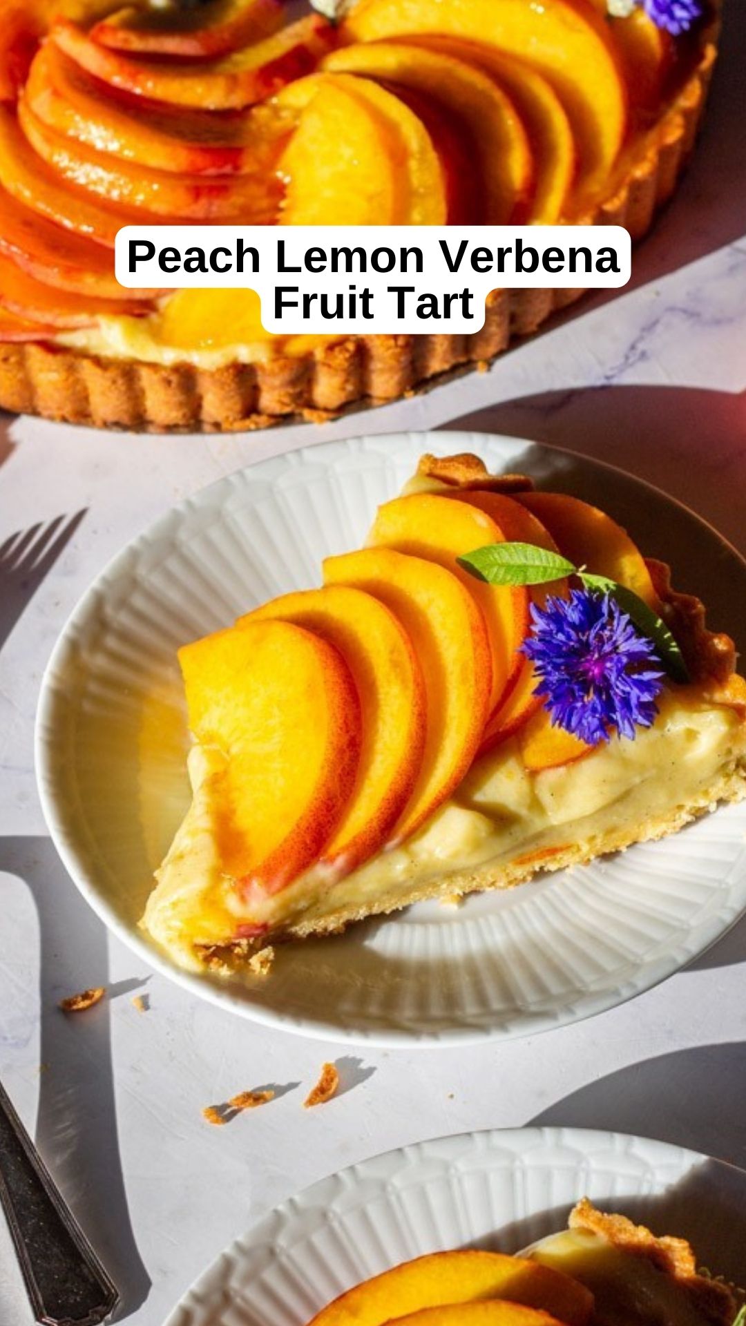 Fresh, juicy peaches are one of our all-time favorite fruits, and when paired with lemon verbena custard in a shortbread pastry shell, they turn into one of our all-time favorite desserts. This peach lemon verbena fruit tart starts with a simple, sweet tart crust that’s baked until golden. It’s then filled with a lemon verbena-infused custard, topped with fresh sliced peaches, and brushed with an apricot glaze. This dessert is fruity, slightly floral, light, and refreshing – the perfect summer fruit tart.