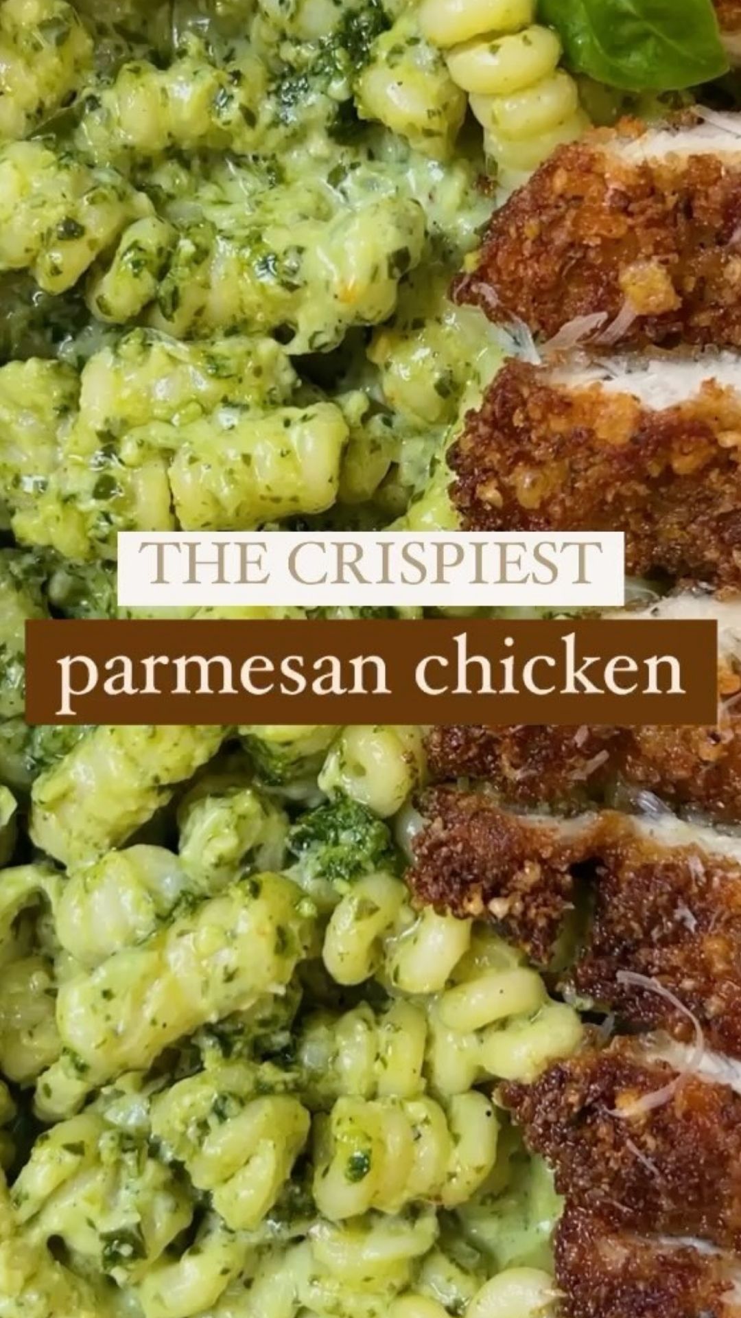 Let’s make some delicious Crispy Chicken to go with creamy pesto pasta! Trust me, this meal is worth the extra effort, especially for Valentine’s Day. Pasta is always a great dinner idea, especially when it’s mixed with pesto and served with crispy parmesan chicken! The pesto pasta is incredibly creamy, bursting with freshness, and the crispy chicken takes it to a whole new level. Even the pickiest eaters won’t be able to resist going back for seconds.