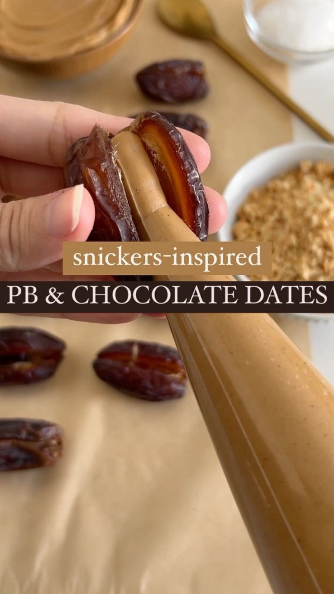 - Transfer peanut butter to a piping bag or ziplock bag. Alternatively, use a spoon to fill each date with peanut butter and sprinkle chopped peanuts on top. Seal the dates shut by pressing at the top.
