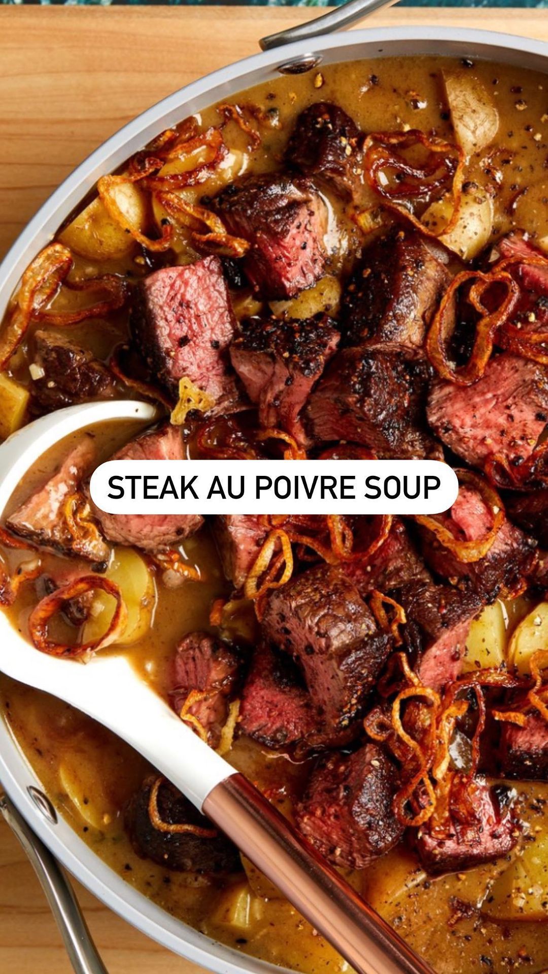 - Divide soup among bowls, top with cubed steak, and garnish with fried shallots. Enjoy your Steak au Poivre Soup!
