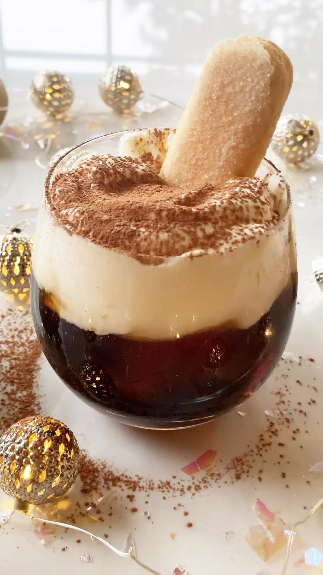 - Using a spoon, divide the whipped cream evenly between the glasses. Use the back of the spoon to smooth it into an even layer that covers the surface of the drink. Dust the tops with cocoa powder, garnish each glass with a half of a Ladyfinger cookie, and serve.