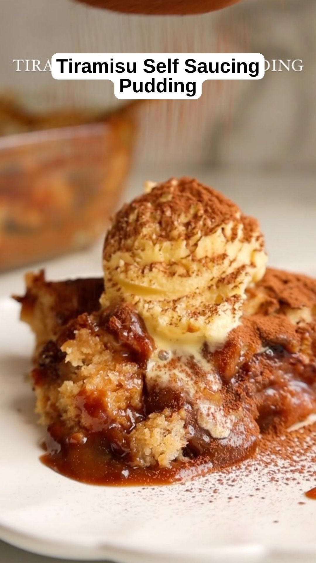 This Tiramisu Self-Saucing Pudding is a warm, gooey version of the classic Italian dessert. It features a soft coffee sponge with a rich caramel coffee sauce and is served with cream and a dusting of cocoa powder.
