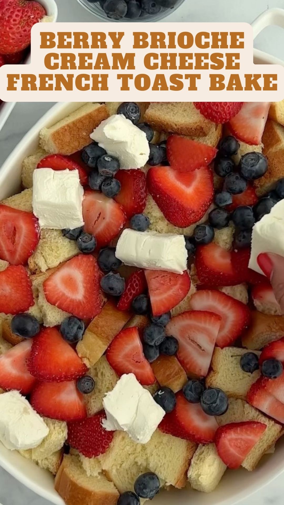 5. Place the brioche cubes in an oven-safe baking dish. Add strawberries and blueberries on top, and scatter the cream cheese cubes around.