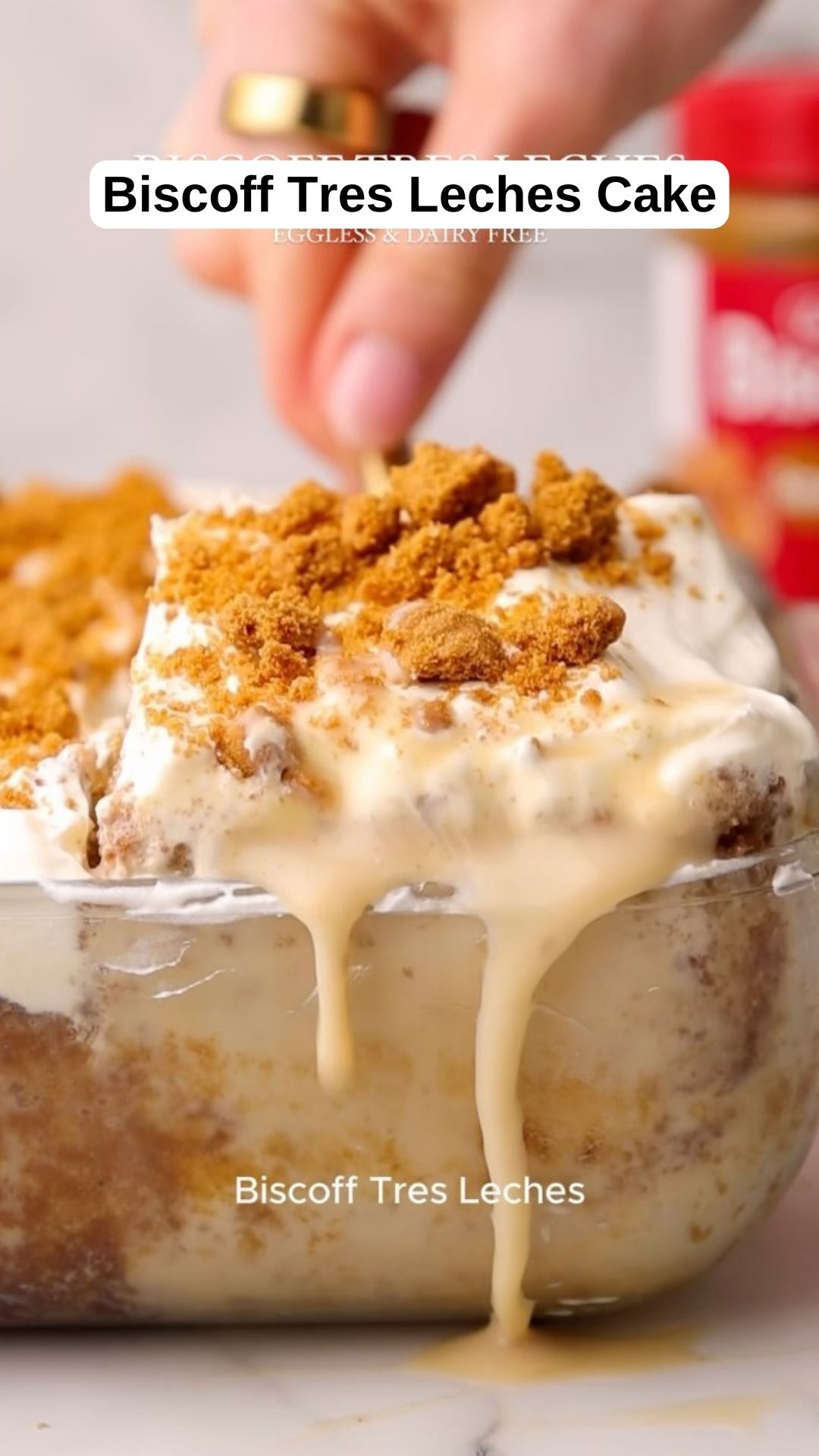 - Slice and serve the cake chilled. Enjoy the creamy, spiced flavors of your Biscoff Tres Leches Cake!