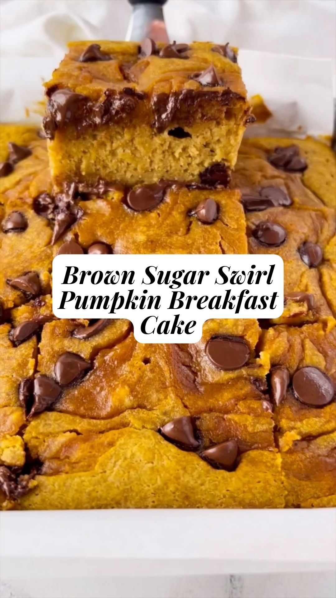 Indulge in the perfect fall breakfast treat: Pumpkin breakfast cake, complete with a delightful brown sugar pumpkin swirl and chocolate chips.