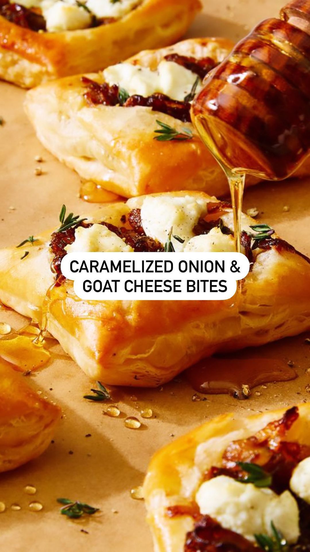 Once the onions cool, spoon a bit onto each puff pastry square along with some crumbled goat cheese for creaminess and tang. Finish with a drizzle of honey for that irresistible sweet and salty contrast. This is the perfect opportunity to use your favorite high-quality honey.