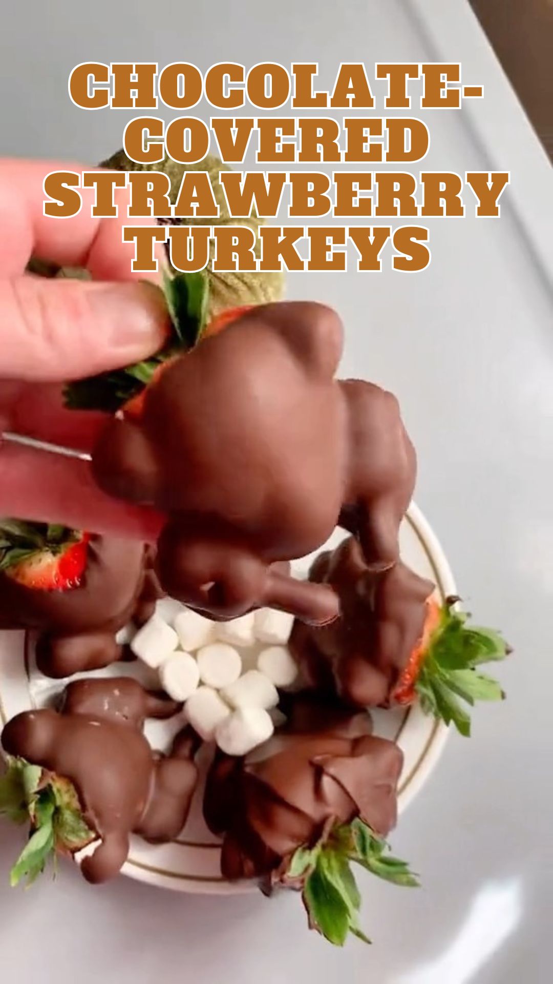Serve these chocolate-strawberry turkeys alongside a platter of pumpkin pie turkeys for the most adorable Thanksgiving dessert table ever!