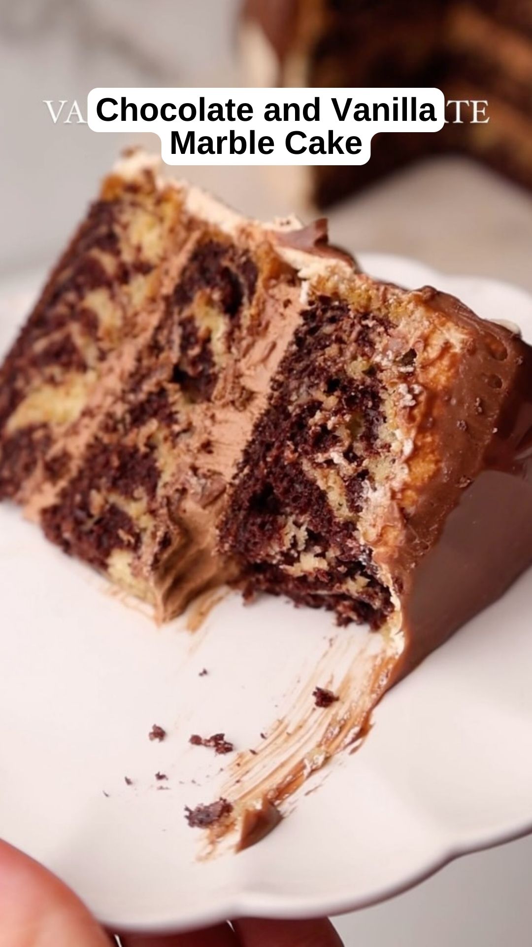 This Chocolate and Vanilla Marble Cake features three layers of the softest vanilla sponge swirled with rich chocolate, layered with velvety whipped chocolate ganache, covered in creamy vanilla buttercream, and finished with a chocolate ganache drip topping. Perfect for any celebration!