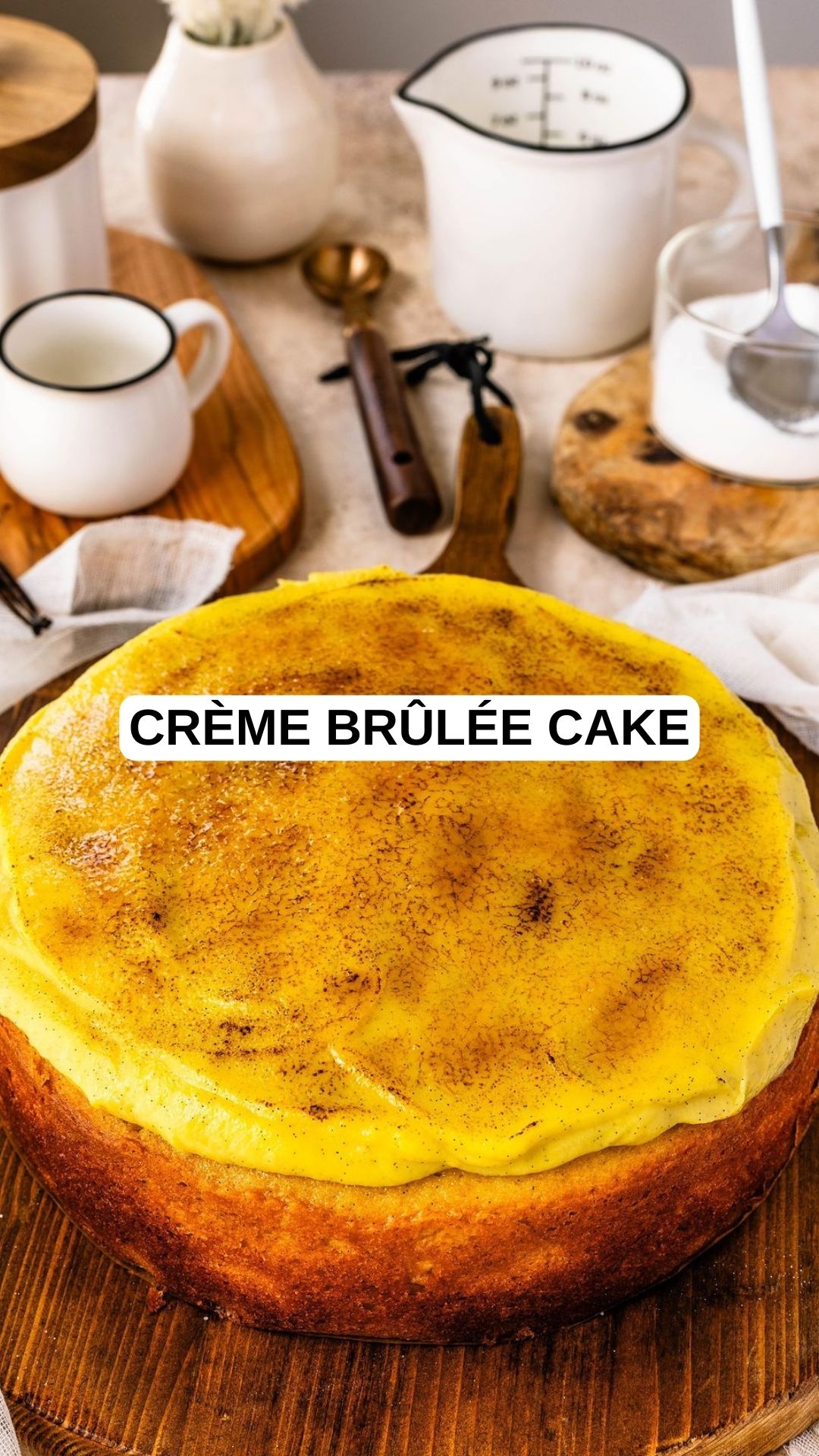 Crème Brûlée Cake is a decadent dessert featuring a fluffy vanilla cake filled and topped with rich vanilla bean pastry cream. The top is caramelized to perfection, creating a delightful crunchy crust.