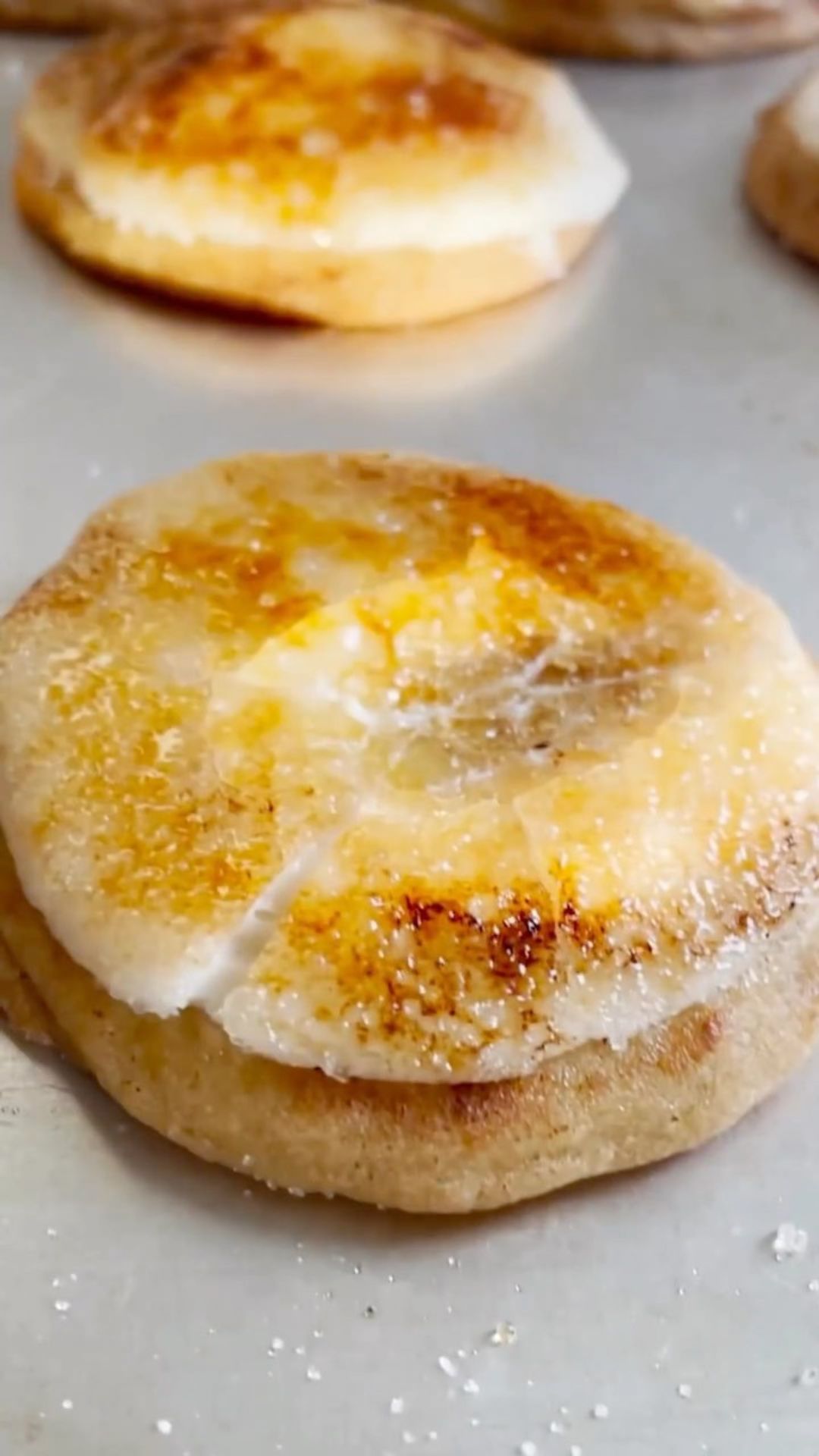 7. Just before serving, use a kitchen torch to caramelize the sugar on top of each cookie, then set aside to cool. Store cookies in the fridge for up to 4 days. Enjoy!