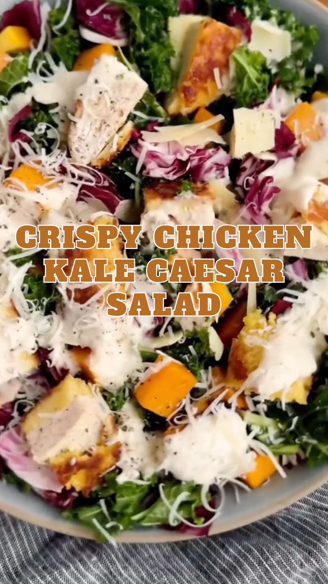 Introducing our crispy chicken kale caesar salad! It’s not your ordinary caesar salad. Picture this: hearty kale, vibrant radicchio, and roasted butternut squash, all topped with our homemade crispy chicken breasts coated in a creamy caesar dressing.