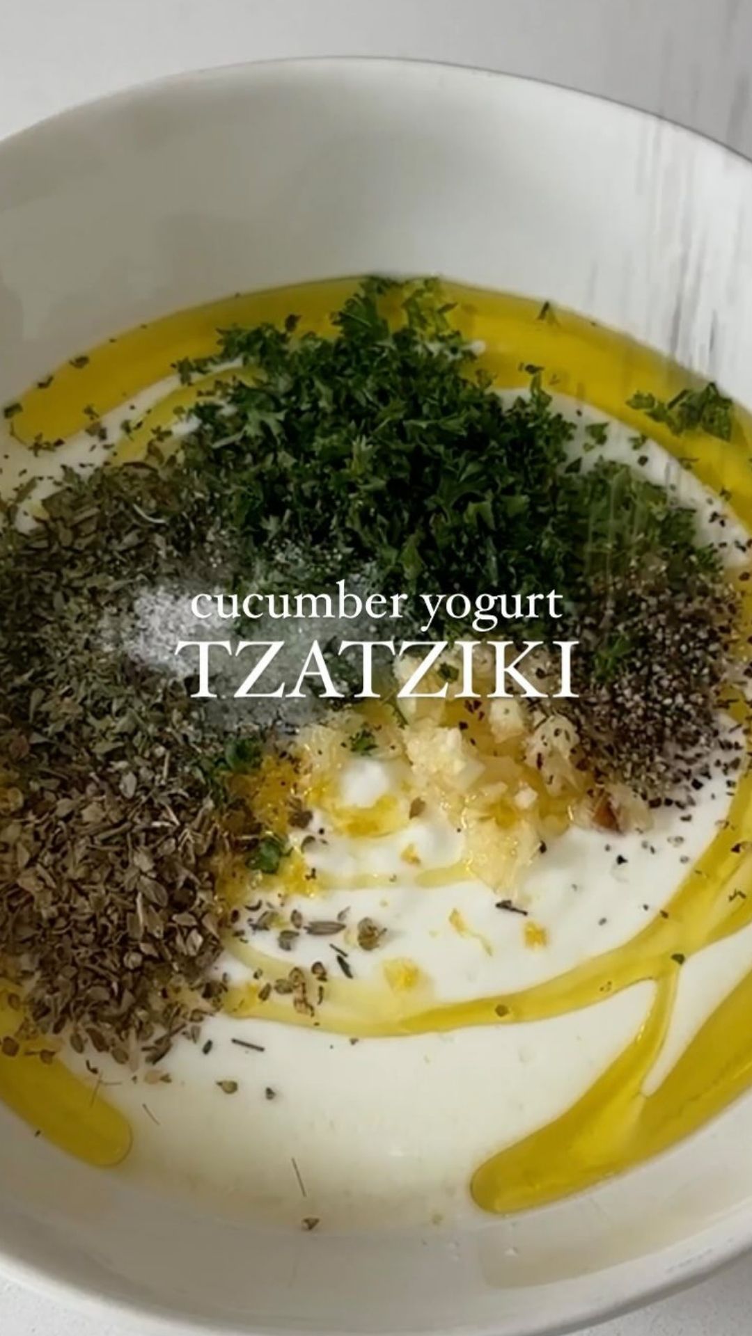 1. In a bowl, combine the yogurt, chopped cucumber, parsley, dried mint, black pepper, minced garlic, basil, salt, lemon juice, lemon zest, and olive oil.