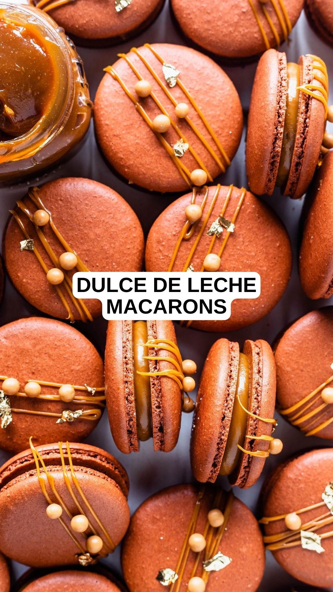 Hi friends! Today, let’s make Dulce de Leche Macarons. These have chocolate shells filled with luscious dulce de leche and a lovely decoration on top. The key to perfect macarons is making sure the dulce de leche is thick enough to hold its shape.