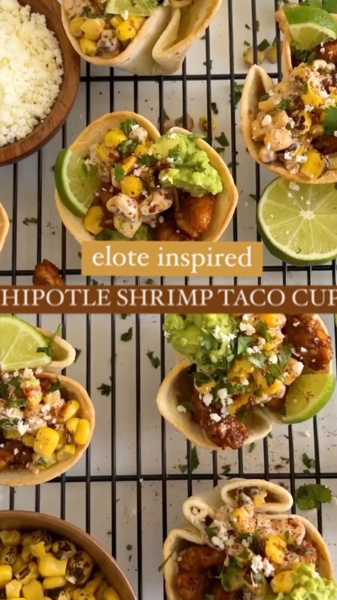 Elote meets chipotle shrimp in these adorable taco cups! They’re my favorite little appetizers to whip up. Isn’t everything cuter when it’s tiny and individual? You can also enjoy these as regular tacos or as a rice bowl if you prefer!