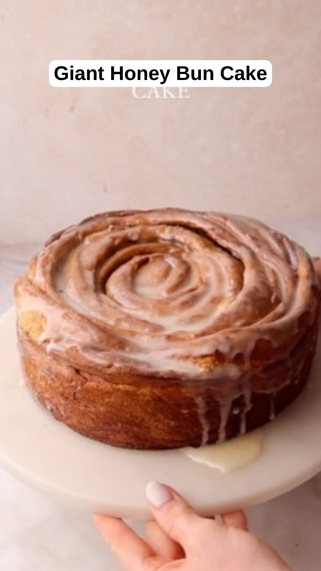 This is basically a giant honey bun, but you cut and serve it like a cake! Made with an easy 7-ingredient dough, honey, and a buttery cinnamon sugar filling, it’s covered in gooey honey icing for that perfect glazed top. It’s super simple to make!