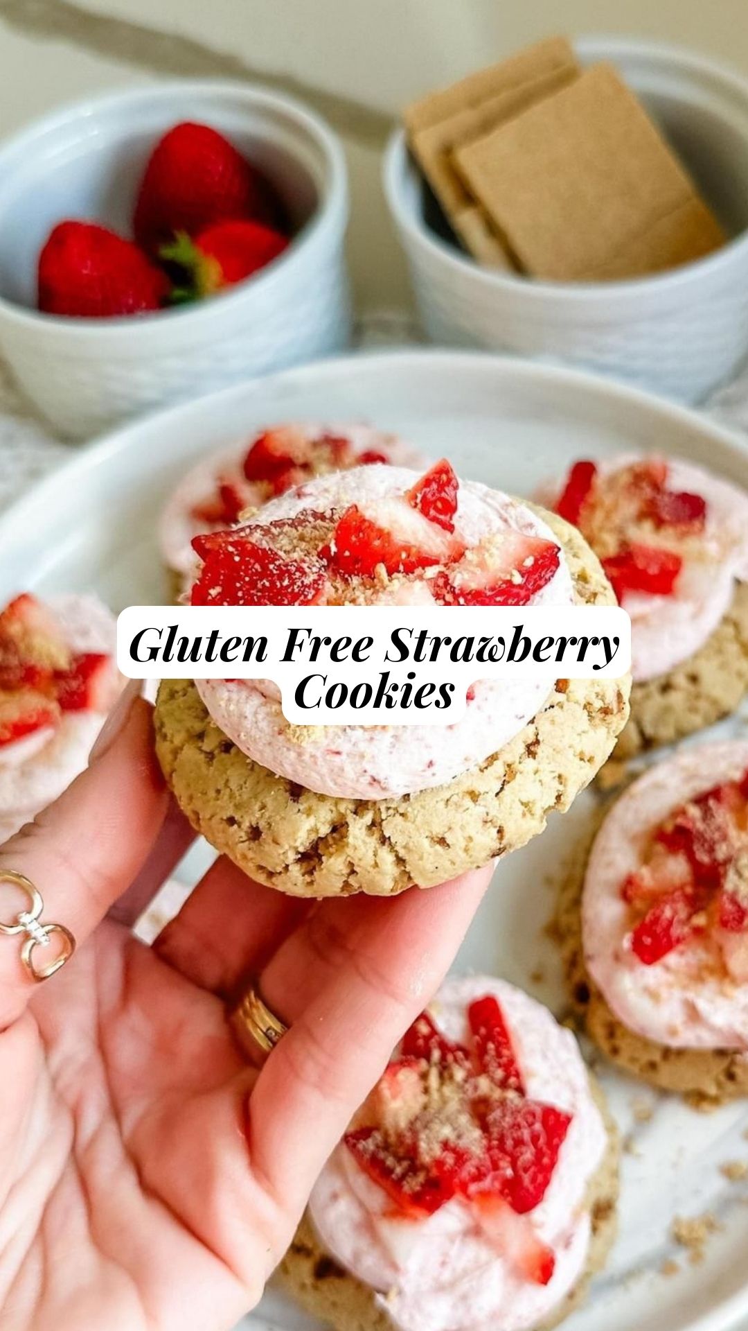 Introducing Gluten-Free Strawberry Cookies that taste just like strawberry shortcake but in a delightful cookie form! These treats feature an almond flour cookie base topped with a dairy-free strawberry buttercream frosting, fresh juicy strawberries, and buttery graham crackers.