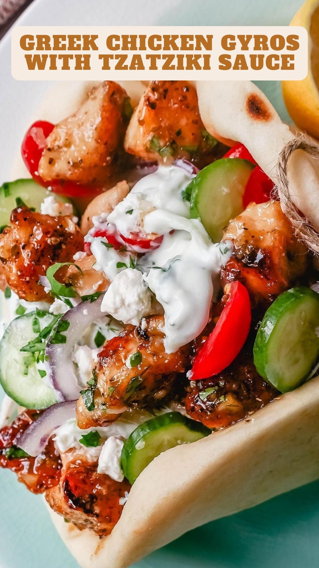 5. **Assemble the Gyros:** Place chicken in pita bread, warm it up if desired. Top with tzatziki sauce and Greek salad. Add extra feta if you’d like.