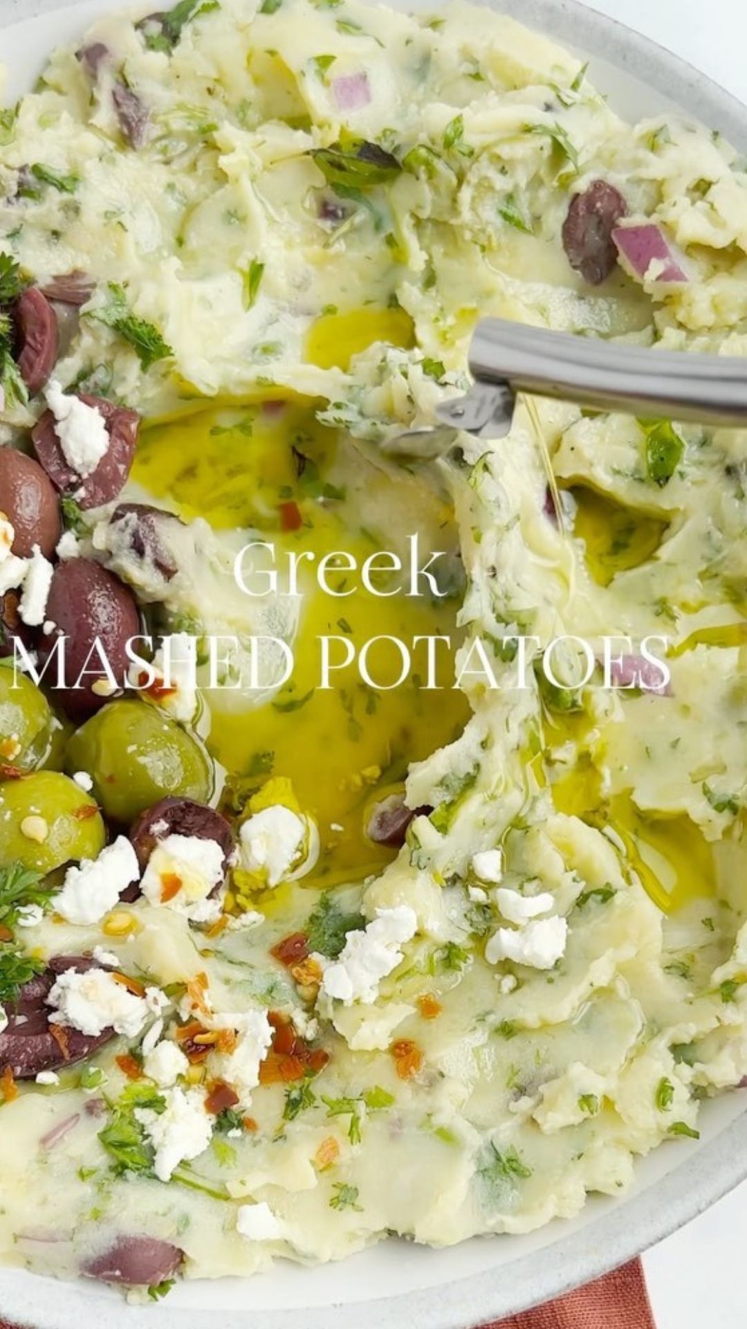 - Mix in the olives and parsley. For an extra flair, garnish with feta cheese, olives, olive oil, and crushed red pepper if you like. Serve it up warm and enjoy this tasty twist on mashed potatoes!