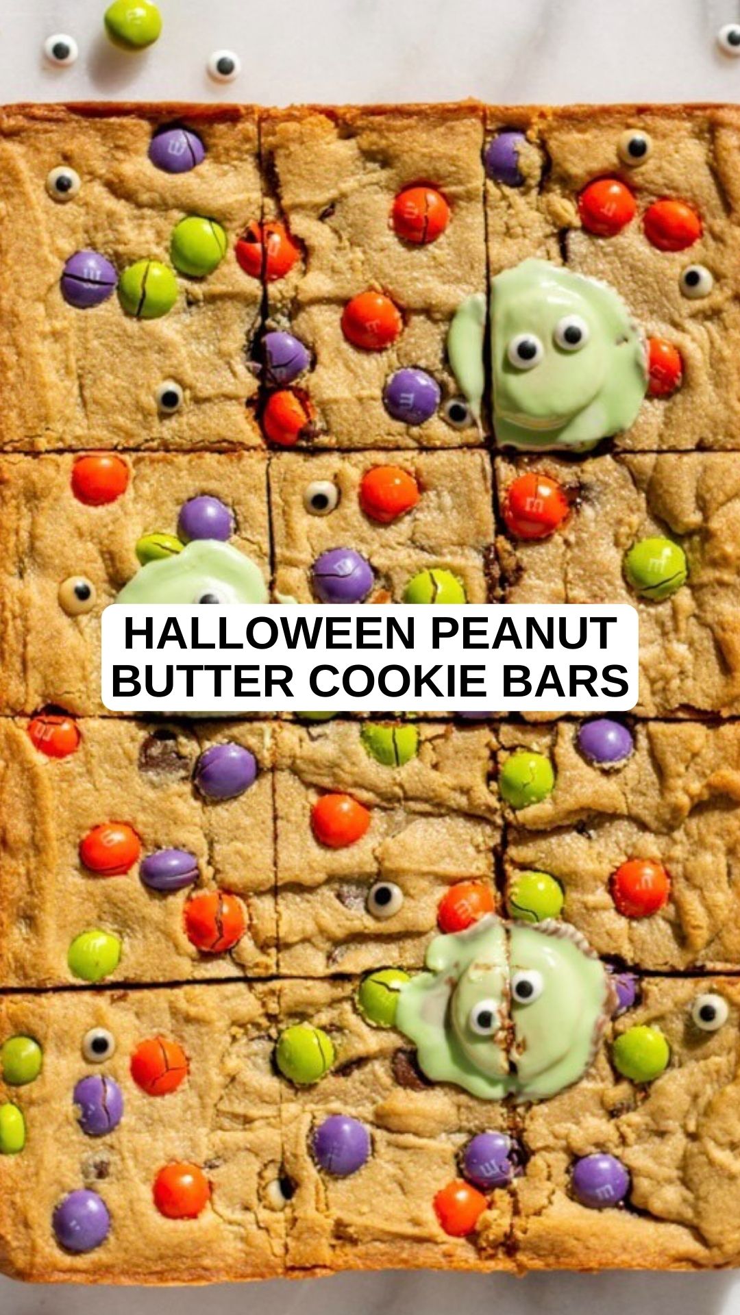 9. Once baked, optionally top the bars with the Halloween Reese’s. Let them sit for about a minute to soften, then press two googly eye sprinkles onto each peanut butter cup.
