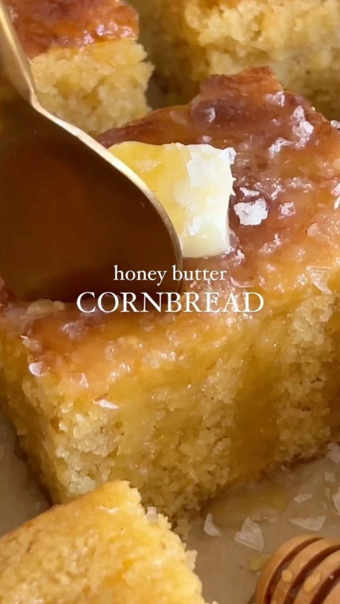 - Once the cornbread is done, let it cool for 10 to 15 minutes, then slice and brush the top with honey butter. Optionally, sprinkle with flaky sea salt.