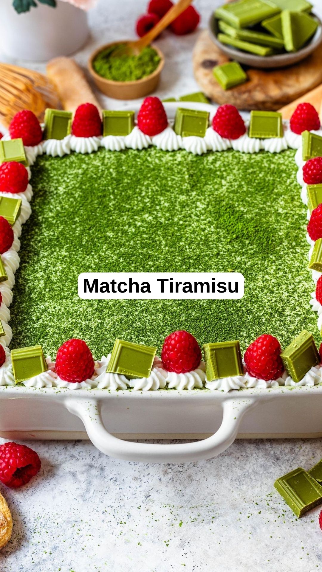 - Sift matcha powder over the tiramisu, pipe whipped cream around the edges, and garnish with fresh raspberries if desired.