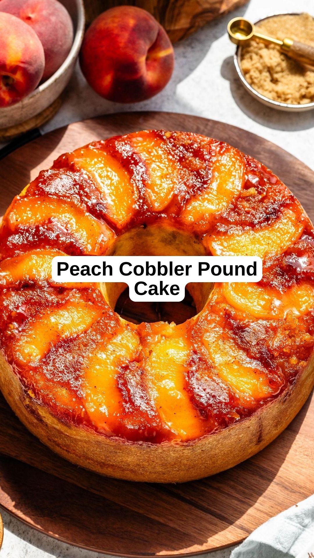 This Peach Cobbler Pound Cake is soft and buttery, packed with caramelized peaches, and topped with a tasty biscuit crumble.
