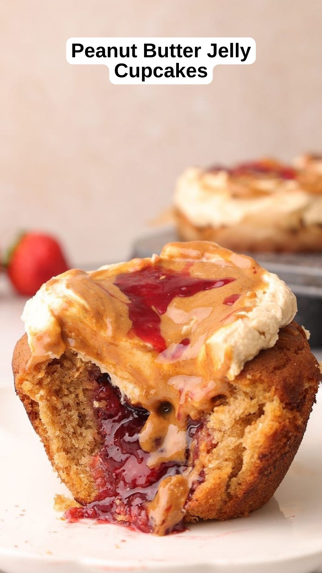 These cupcakes feature soft peanut butter muffins filled with homemade berry jam, topped with creamy peanut butter frosting, and finished with a drizzle of peanut butter and jam. They are egg-free and can be made dairy-free.