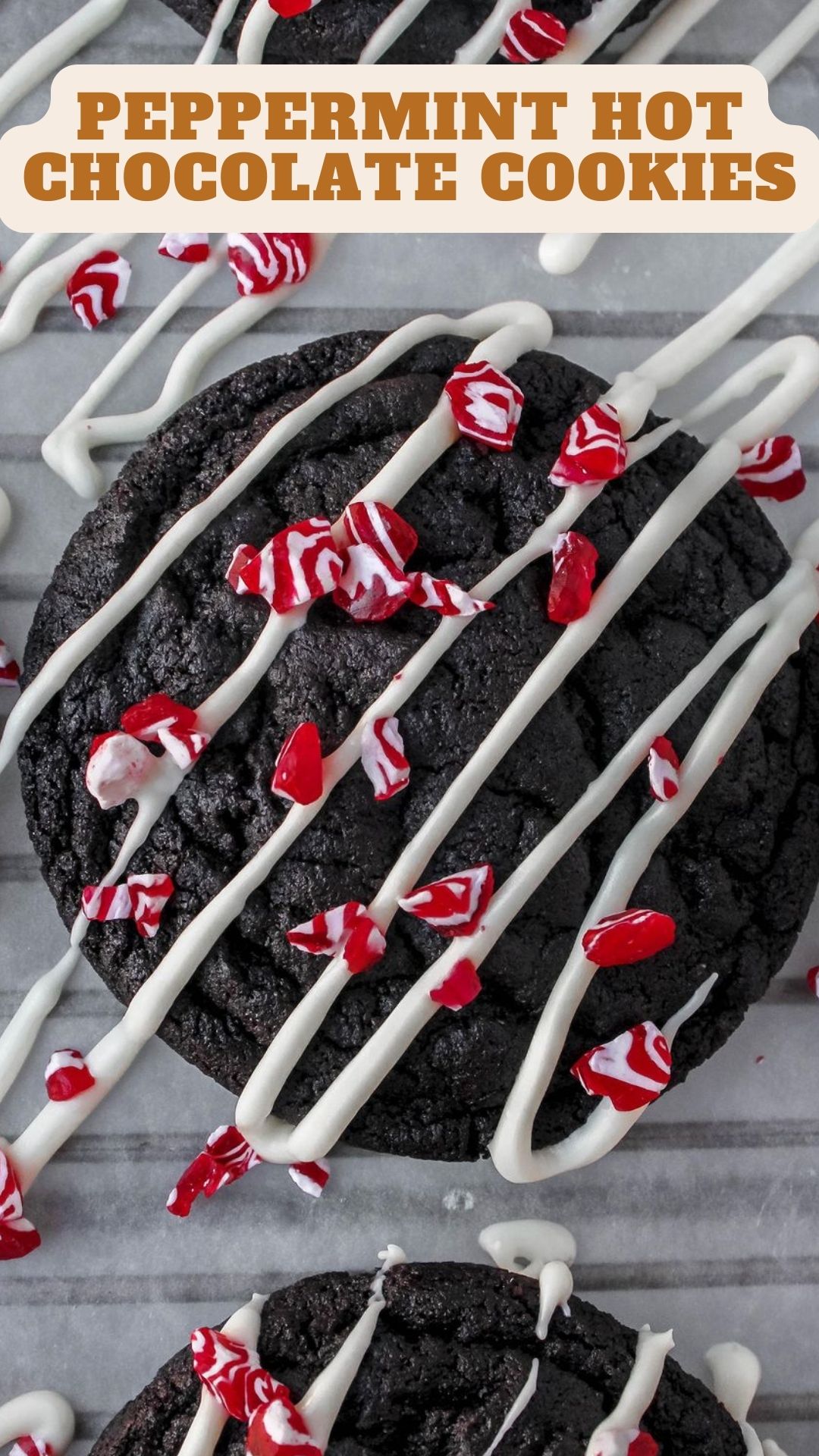 These delicious Peppermint Hot Cocoa cookies feature a chewy chocolate base, covered in white chocolate and crushed candy canes. Decorating them is a breeze, making them perfect for any festive gathering this holiday season.