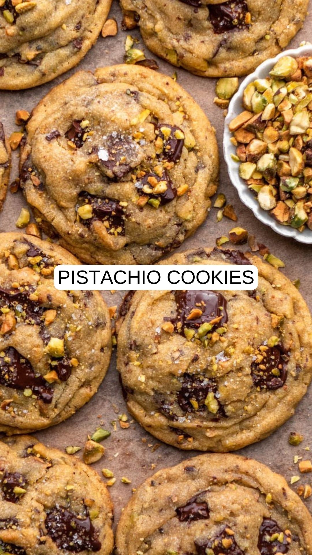 - Flaky sea salt (extra chopped chocolate, and extra chopped pistachios for sprinkling on top of cookies)