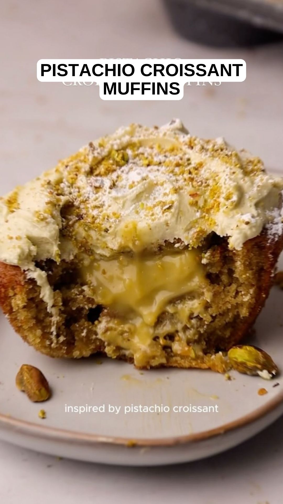 These muffins are inspired by a Pistachio Croissant. They have a soft, buttery pistachio sponge inside, like a fluffy cake, filled with creamy pistachio flavor. On top, there’s pistachio buttercream, crushed pistachios, and a sprinkle of powdered sugar. They taste and smell just like bakery treats, but they’re super easy to make. Best part? No eggs or dairy needed!