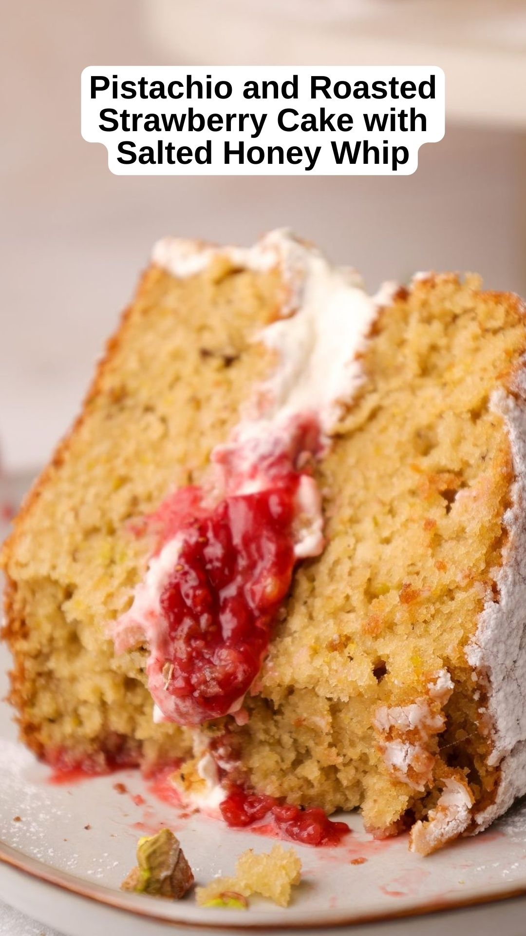 This cake is incredibly delicious, with a soft, nutty pistachio base and juicy, oven-roasted strawberries. Roasting the strawberries enhances their flavor, making them sweeter and a perfect match for the salty, nutty taste of pistachios. The salted honey whip ties it all together with a perfect balance of sweet and salty.